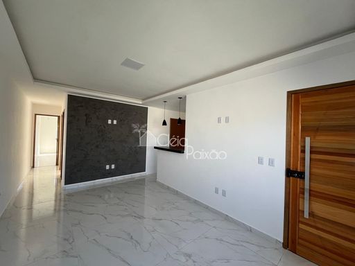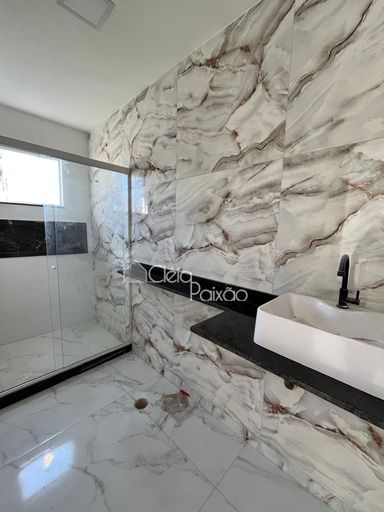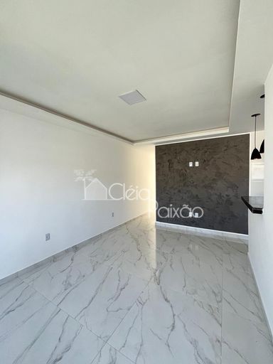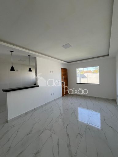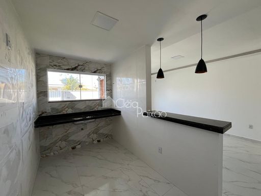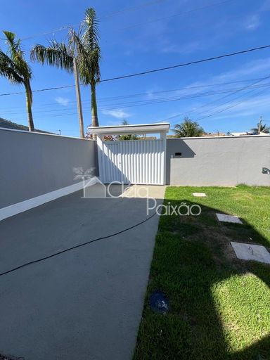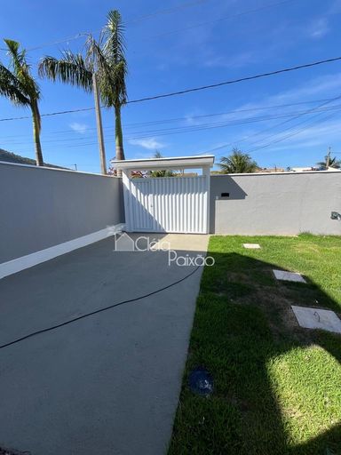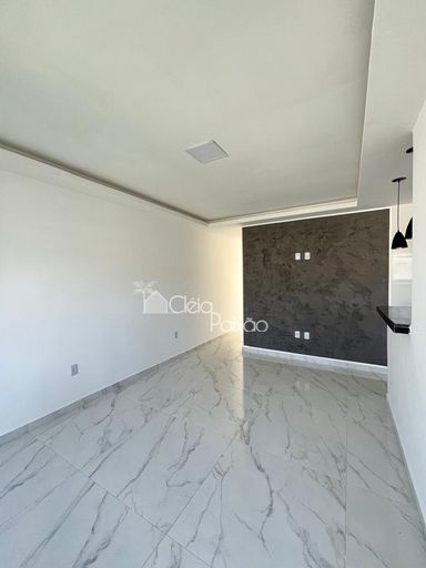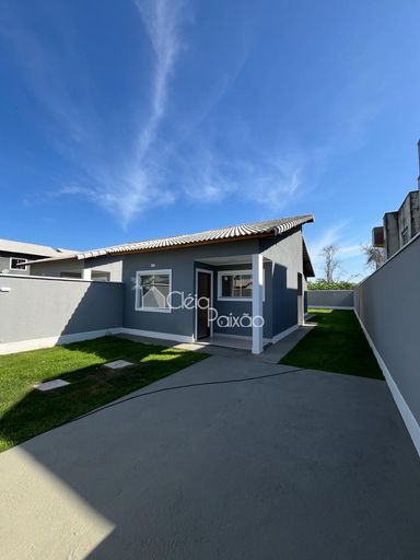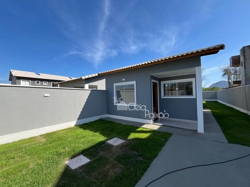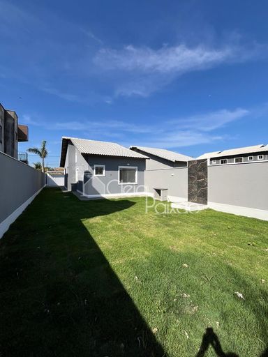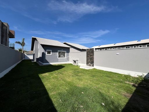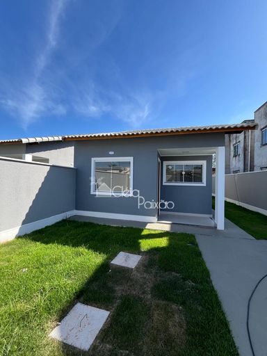 Casa com dois quartos sendo 1 suíte, ampla sala, cozinha americana, banheiro social, área de serviço, quintal gramado e vagas na garagem.