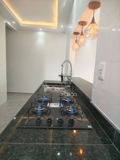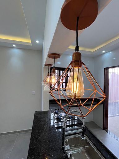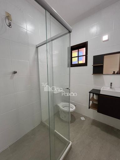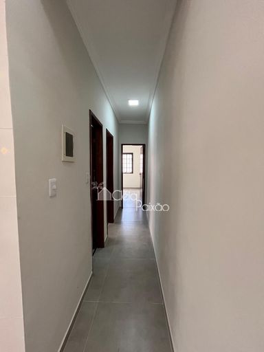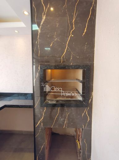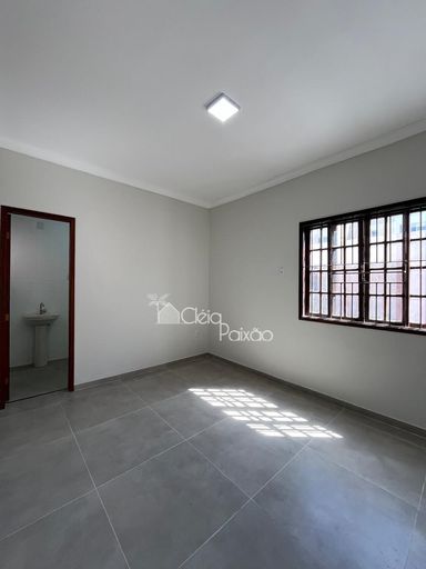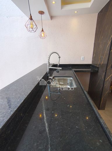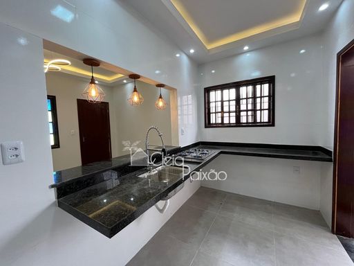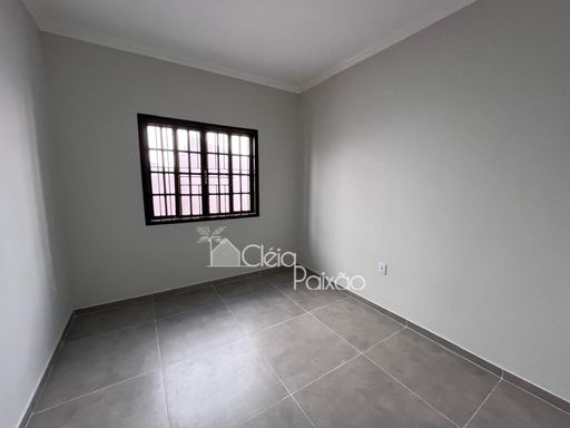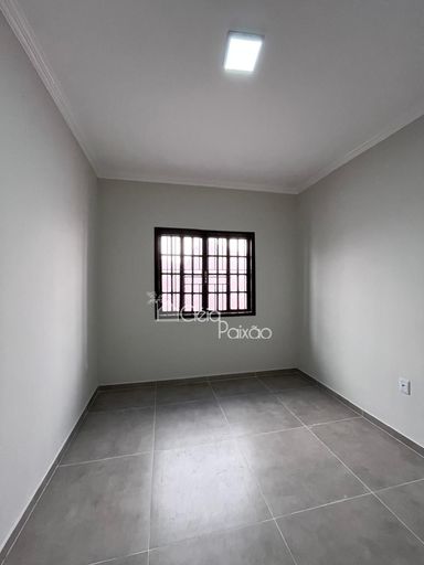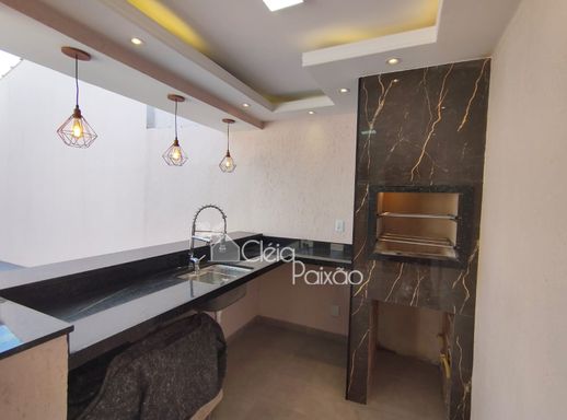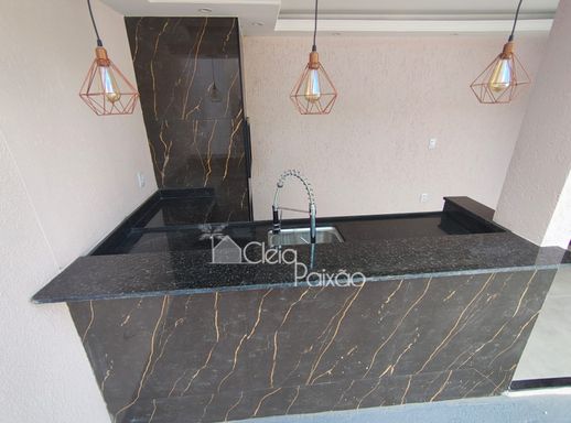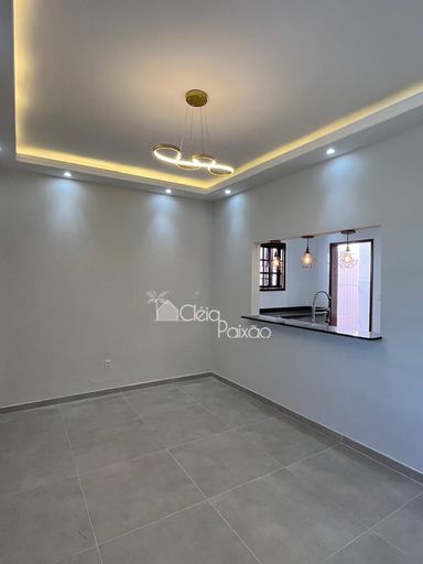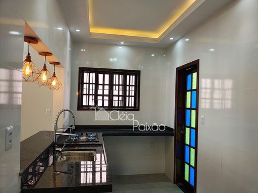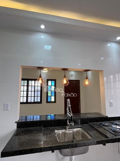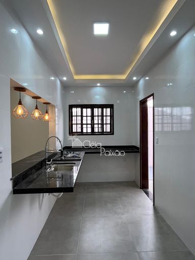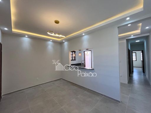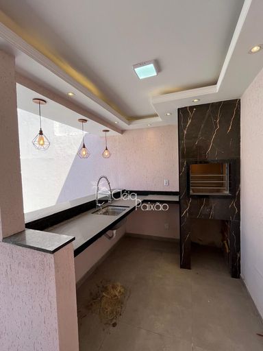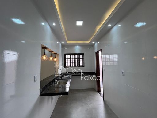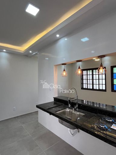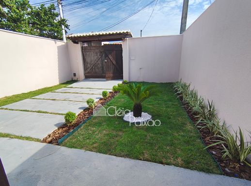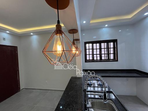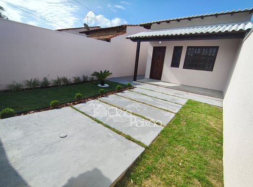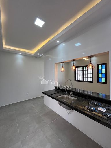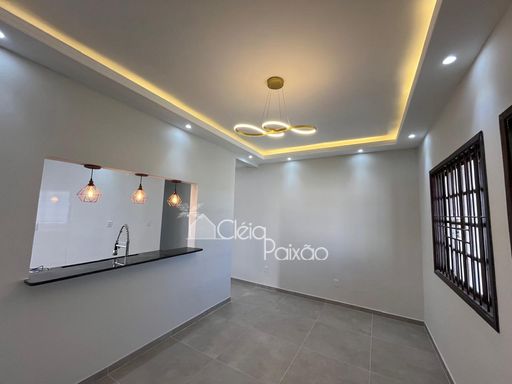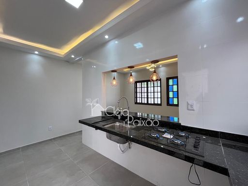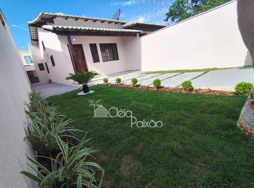 Casa com dois quartos sendo 1 suíte, ampla sala, cozinha, banheiro social, quintal gramado, área de serviço, área gourmet com churrasqueira, pia e lavabo.