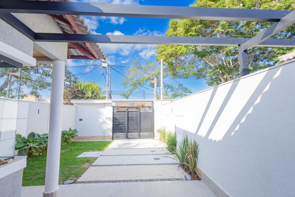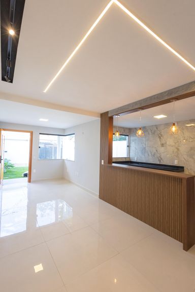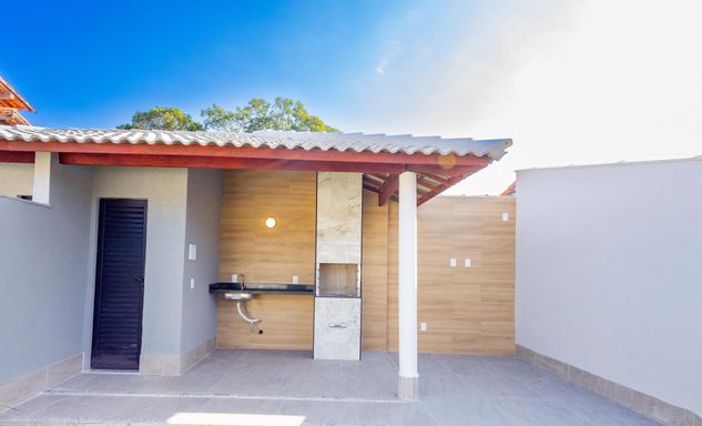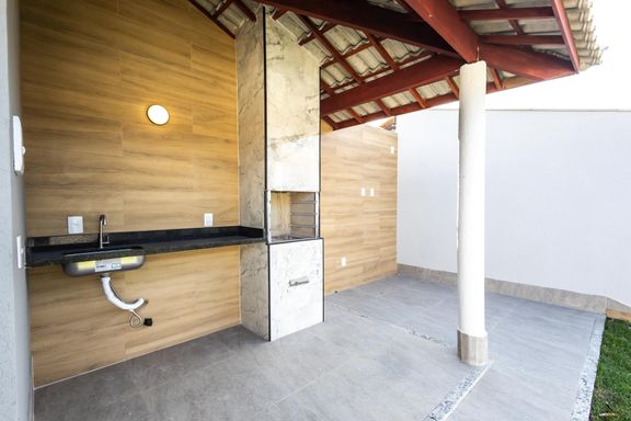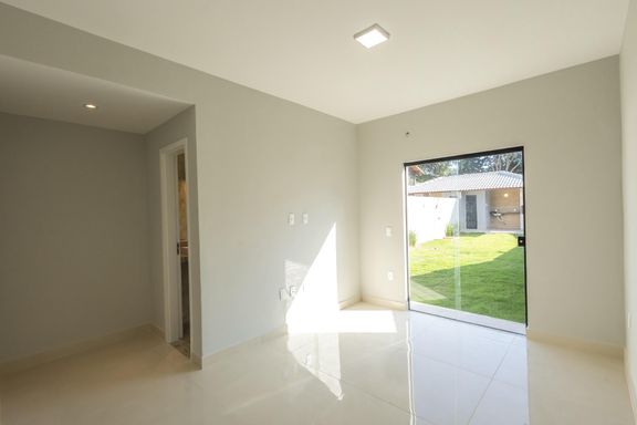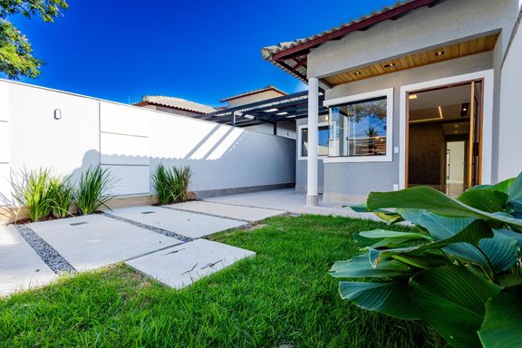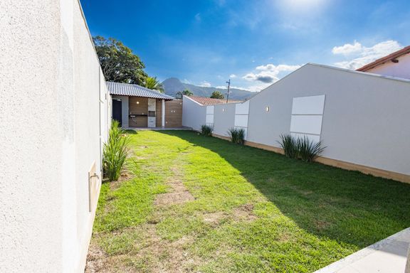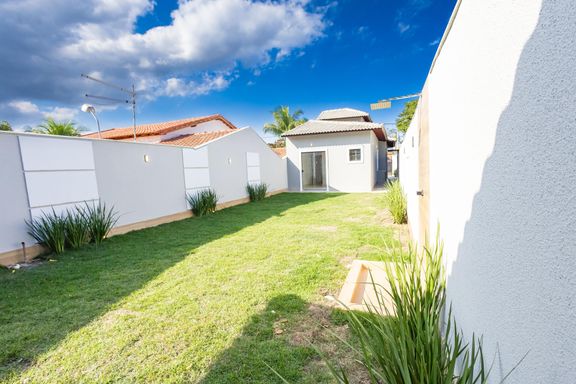 Mais uma belíssima casa com dois quartos sendo 1 suíte, ampla sala, cozinha americana, área de serviço, área gourmet com churrasqueira, pia e lavabo, vagas na garagem e quintal gramado com paisagismo.