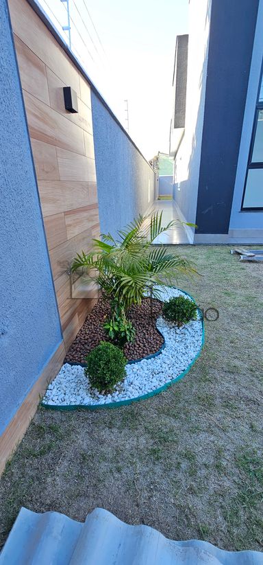 Quintal gramado com paisagismo e vagas na garagem.