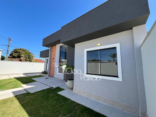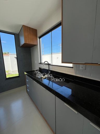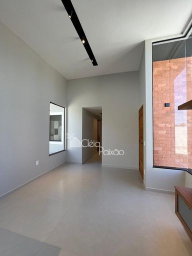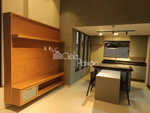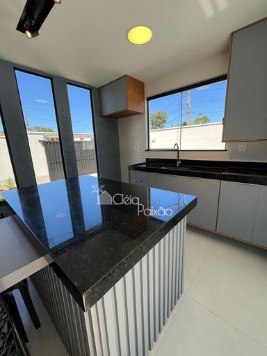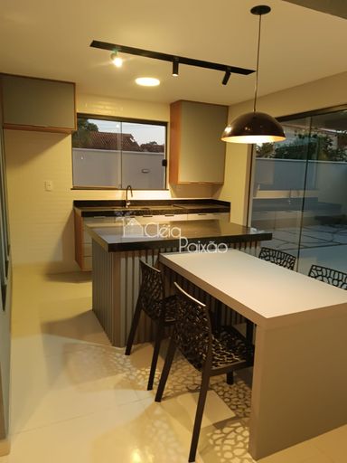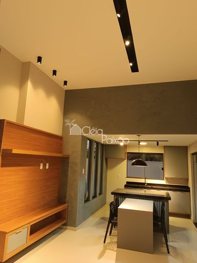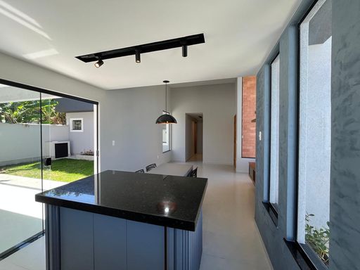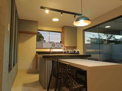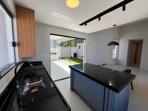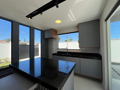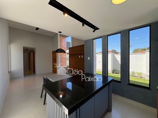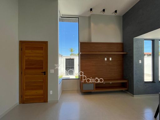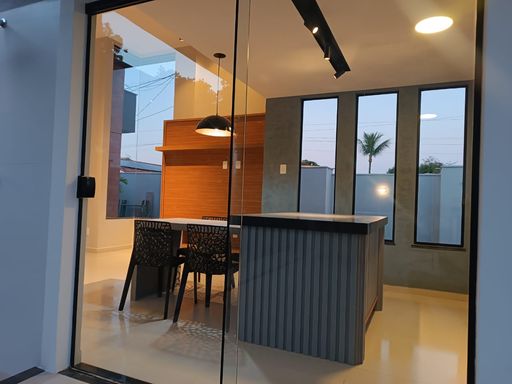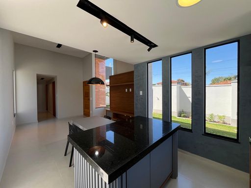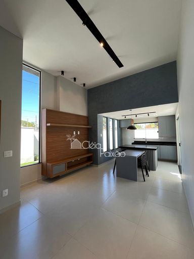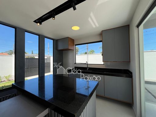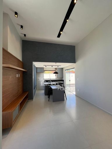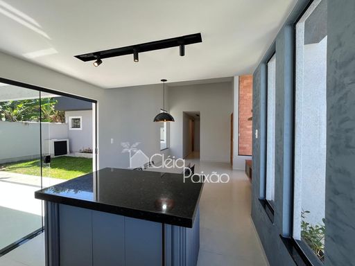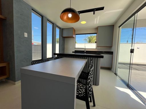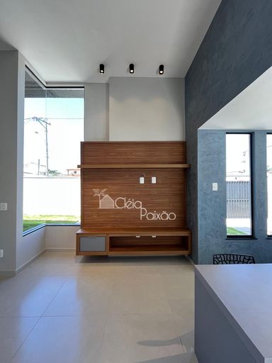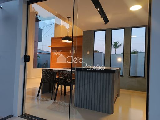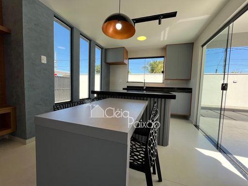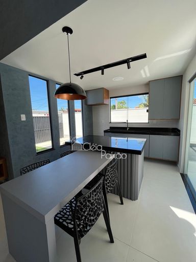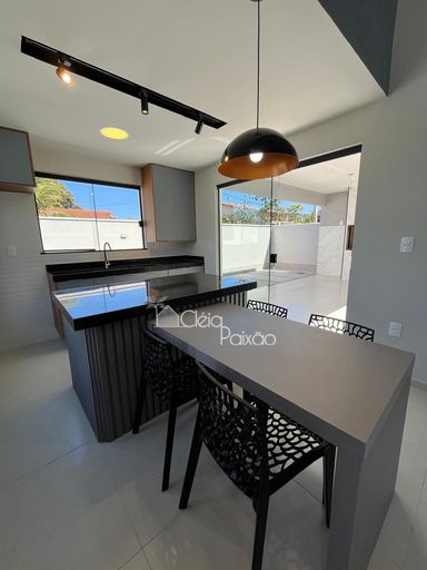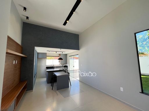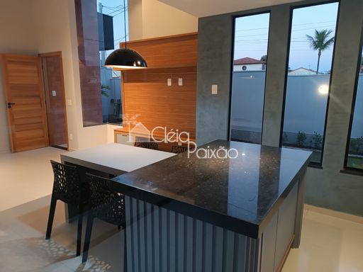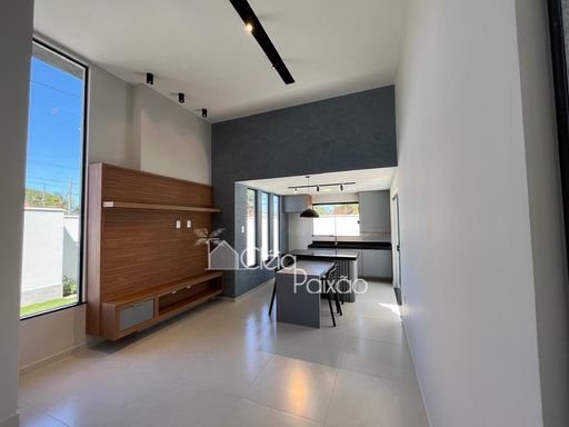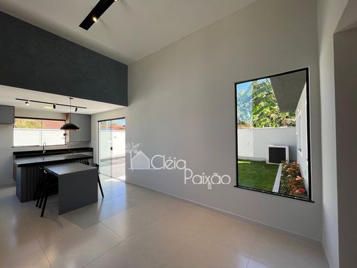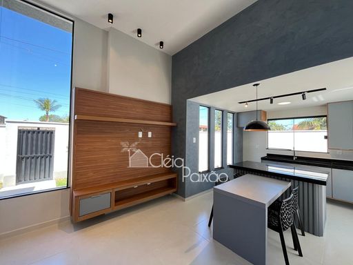 Belíssima casa moderna com 3 quartos sendo 1 suíte, ampla sala com o pé direito alto e rack para TV, cozinha conceito aberto com móveis planejado e mesa com 4 cadeiras.
