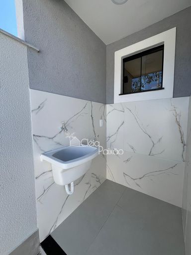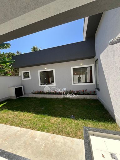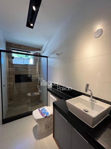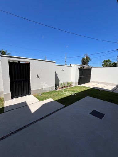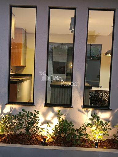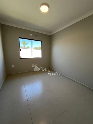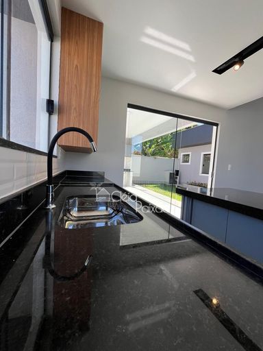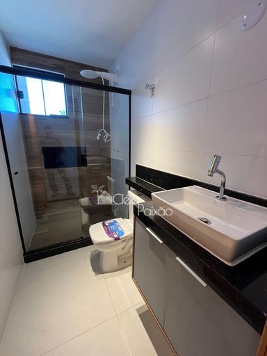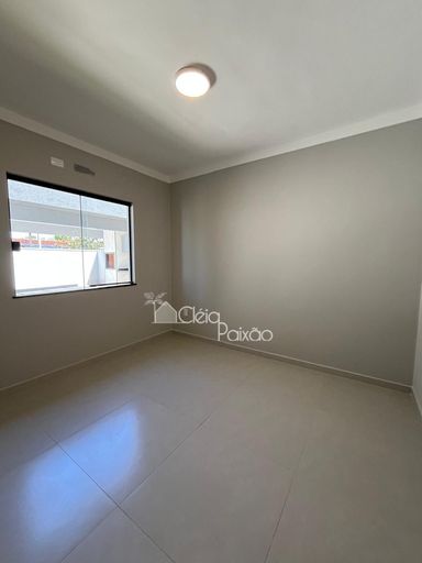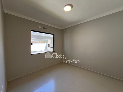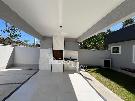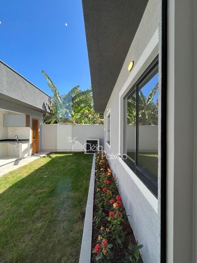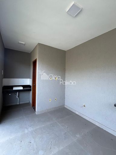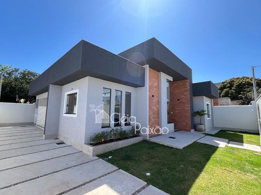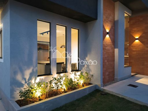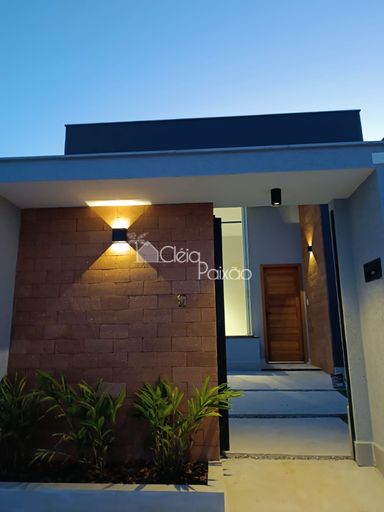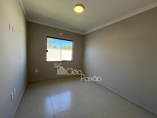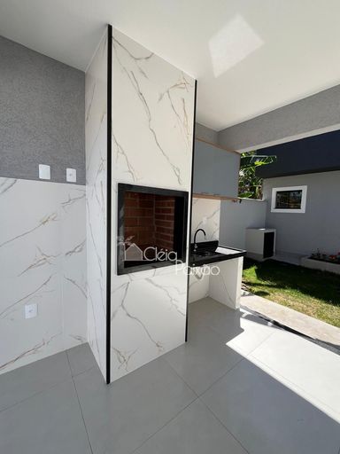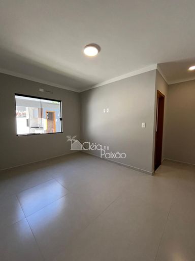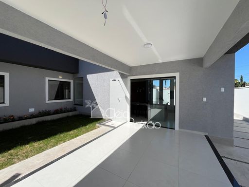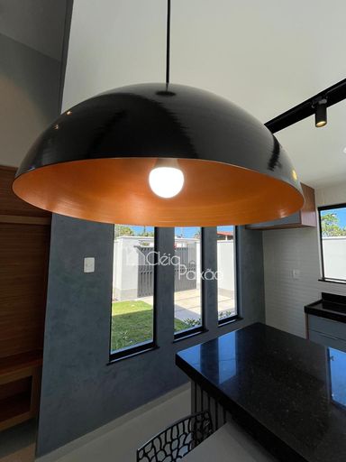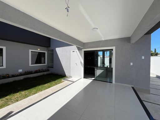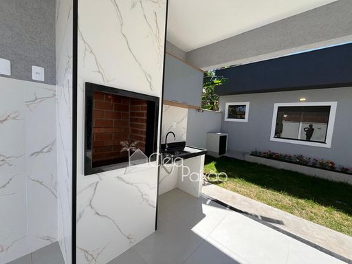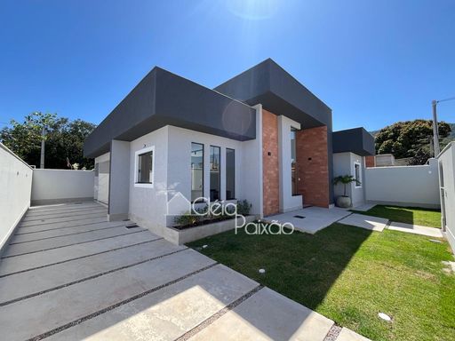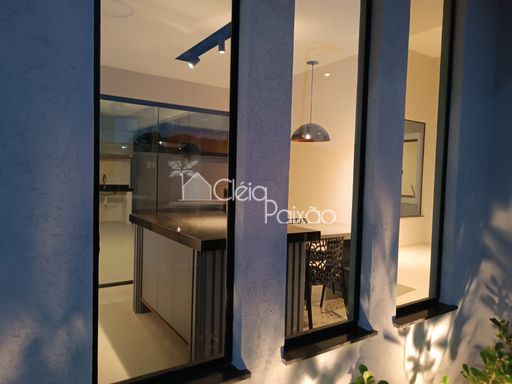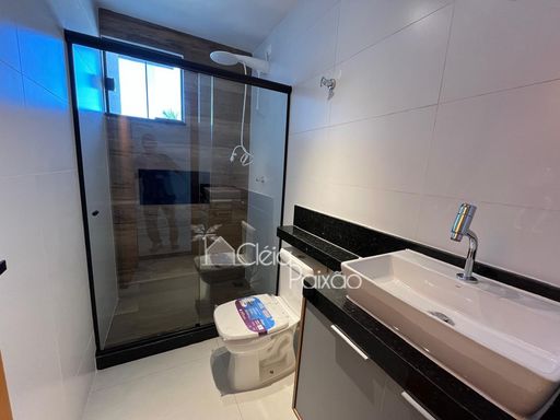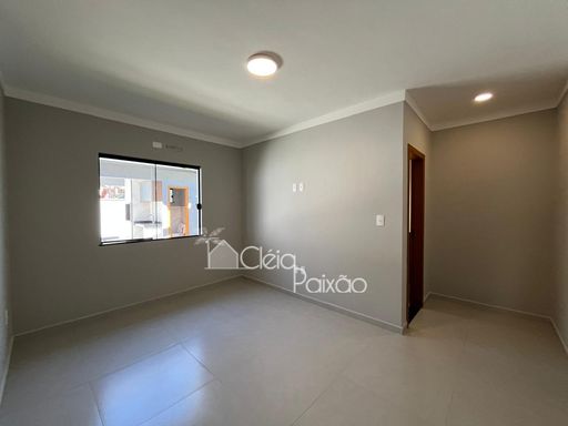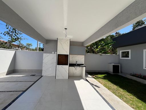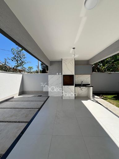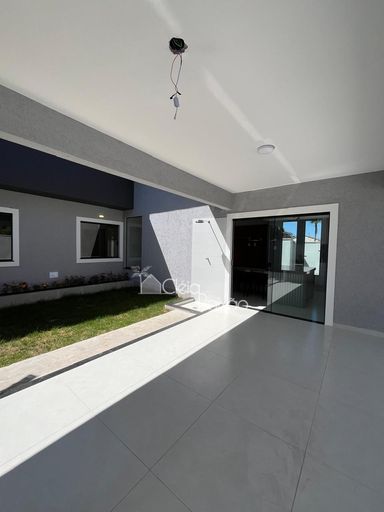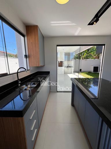 Belíssima casa moderna com 3 quartos sendo 1 suíte, ampla sala com o pé direito alto e rack para TV, cozinha conceito aberto com móveis planejado e mesa com 4 cadeiras.