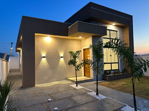 Casa linda e moderna composta por 3 quartos sendo 1 suíte com closet, ampla sala, cozinha americana, área de serviço, área gourmet integrada à cozinha, quintal gramado e com paisagismo.