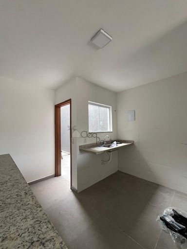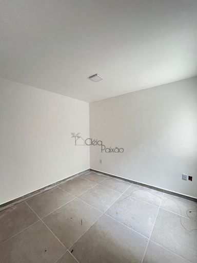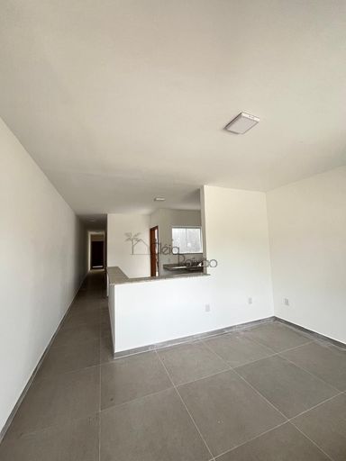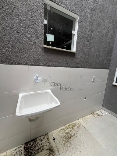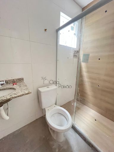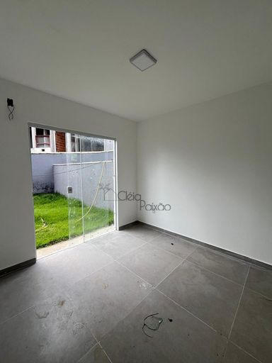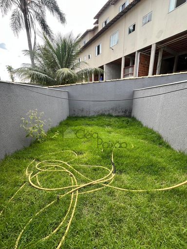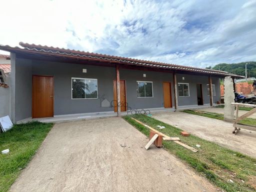 Casas com dois quartos, sala, cozinha, banheiro social, área de serviço, varanda e vagas na garagem.